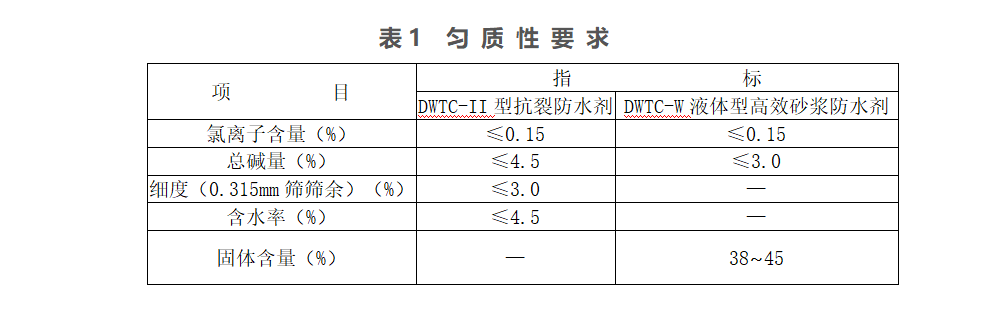 1)DWTC-II型抗裂防水劑、DWTC-W液體型高效砂漿防水劑的勻質(zhì)性指標(biāo)見表1