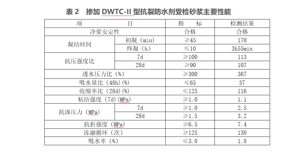 2)摻加DWTC-II型抗裂防水劑受檢砂漿主要性能指標(biāo)見表2