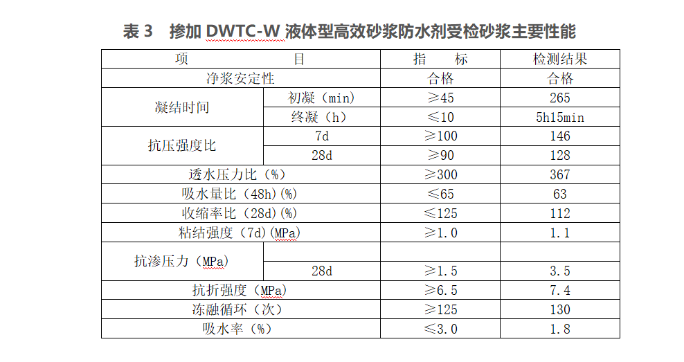 3)摻加DWTC-W液體型高效砂漿防水劑的受檢砂漿性能指標(biāo)見表3
